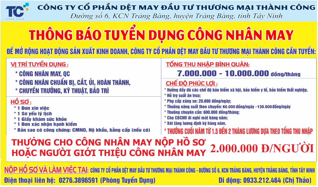 Công ty CP DM ĐT TM Thành Công (may) tuyển dụng gấp các vị trí: công nhân may, QC, cắt, ủi ... Địa chỉ: Đường số 6, KCN Trảng Bàng, phường An Tịnh, thị xã Trảng Bàng, tỉnh Tây Ninh