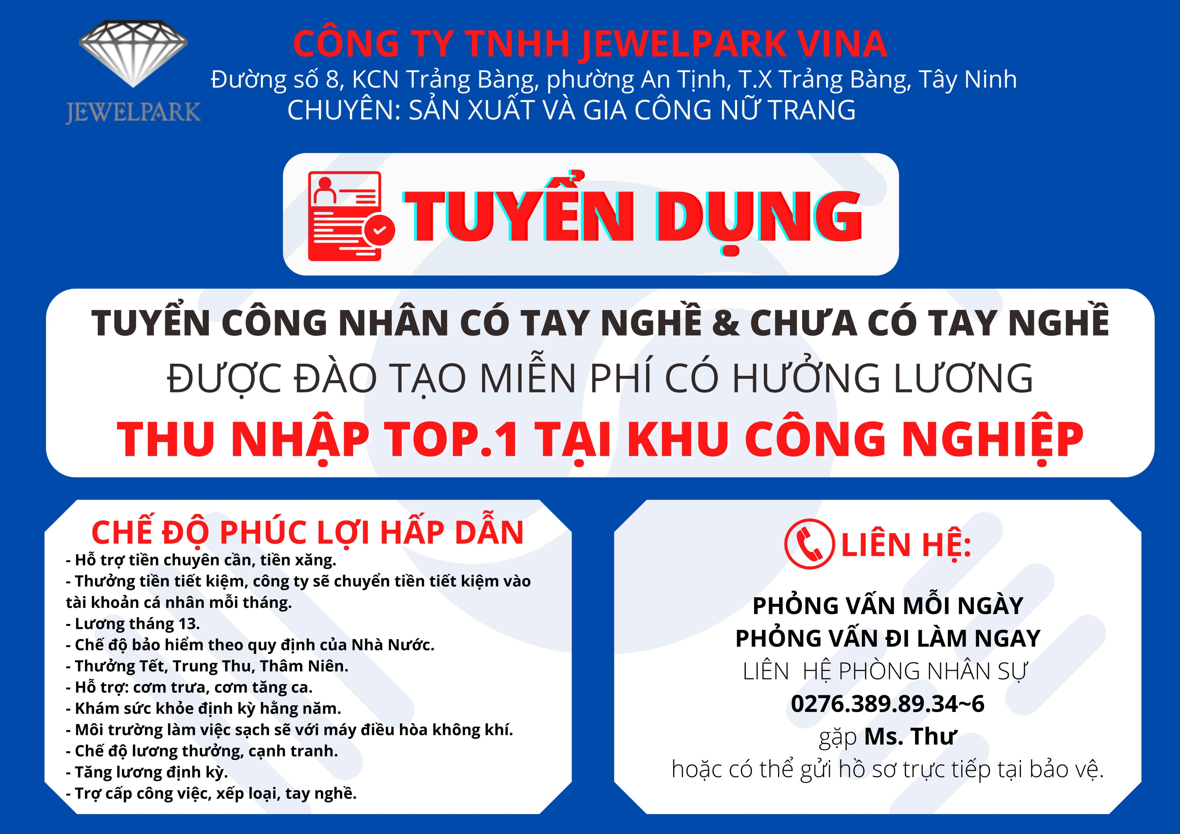 Công ty TNHH JewelPark Vina tuyển dụng gấp công nhân có tay nghề hoặc chưa có tay nghề được đào tạo miễn phí và có hưởng lương